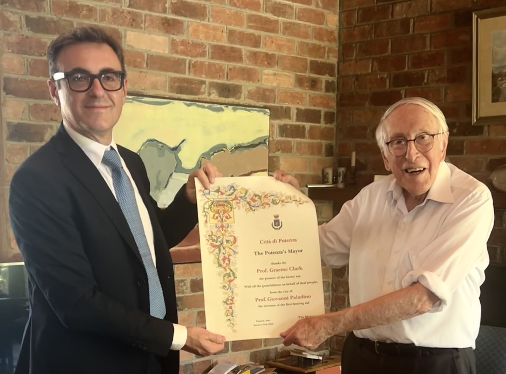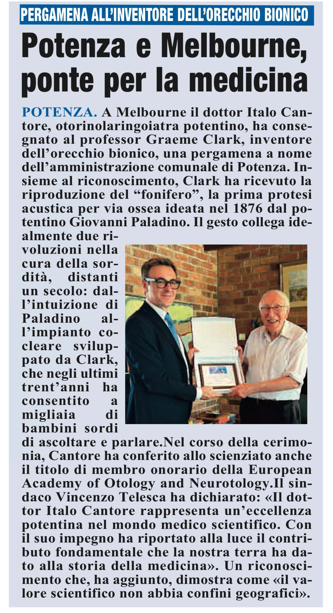 -Febbraio 2026. Il dr. Italo Cantore ha partecipato ad attività chirurgiche presso il Royal Eye and Ear Hospital di Melbourne,Australia, dove fu eseguito il primo intervento di orecchio bionico multielettrodo della storia dal prof. Graeme Clark, prefattore del suo libro. Con l'occasione, il dr. Italo Cantore ha consegnato al prof. Clark, a nome del presidente, una targa di conferimento del titolo di membro onorario della European Academy of Otology and Neurotology, oltre ad una copia fedele del "fonifero"del 1876 del potentino Giovanni Paladino, prima protesi acustica per via ossea della storia, riscoperto dalle ricerche del dr. Rocco Cantore. Ad accompagnare il fonifero una pergamena di riconoscimento del sindaco di Potenza Vincenzo Telesca al prof. Clark per la sua straordinaria invenzione, che ha cambiato il destino delle persone sorde, a cento anni di distanza da quella del potentino Paladino.